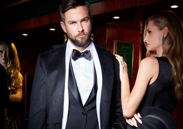 Eine schwarze Schleife, Schuhe aus Lack- oder Kalbsleder sowie Hosenträger und/oder Kummerbund ergänzen den „Black Tie“ Look.